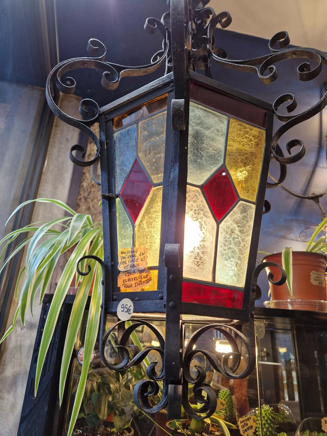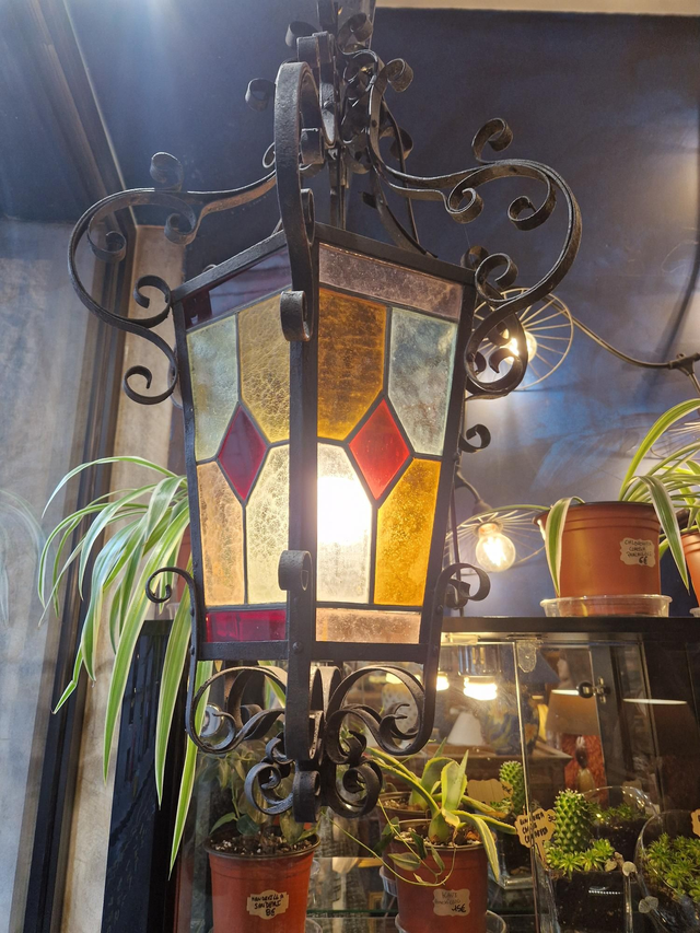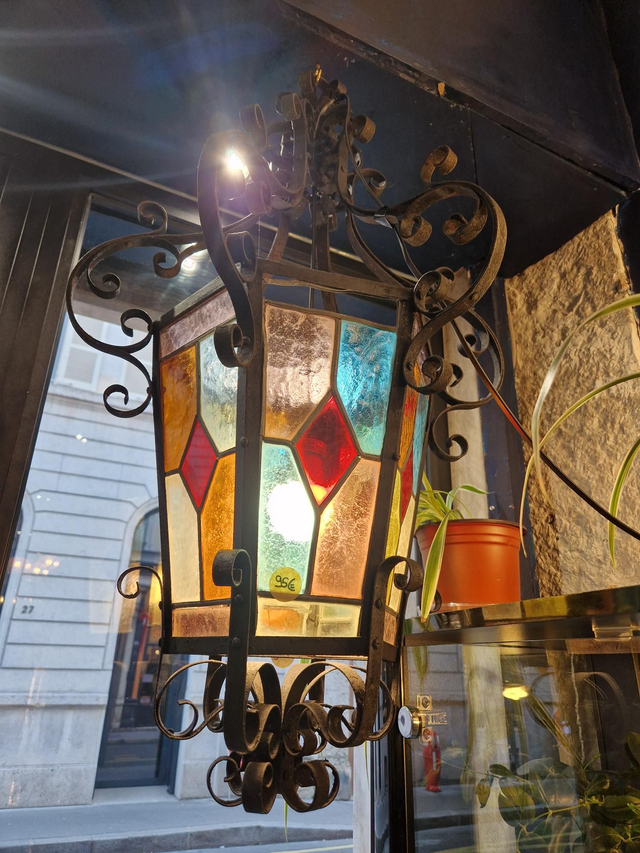 Ancienne Lanterne en fer forgé et vitraux. Electrifiée pour l'intérieur. Manque un petit vitrail en haut dans le dos.