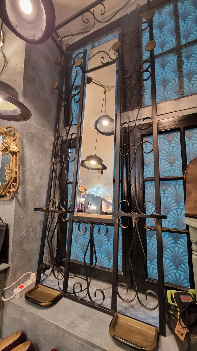 Veritable meuble d'entrée en fer forgé. Porte chapeau, porte manteau et porte parapluie avec son grand miroir. En très bon état malgré quelques traces d'usures.