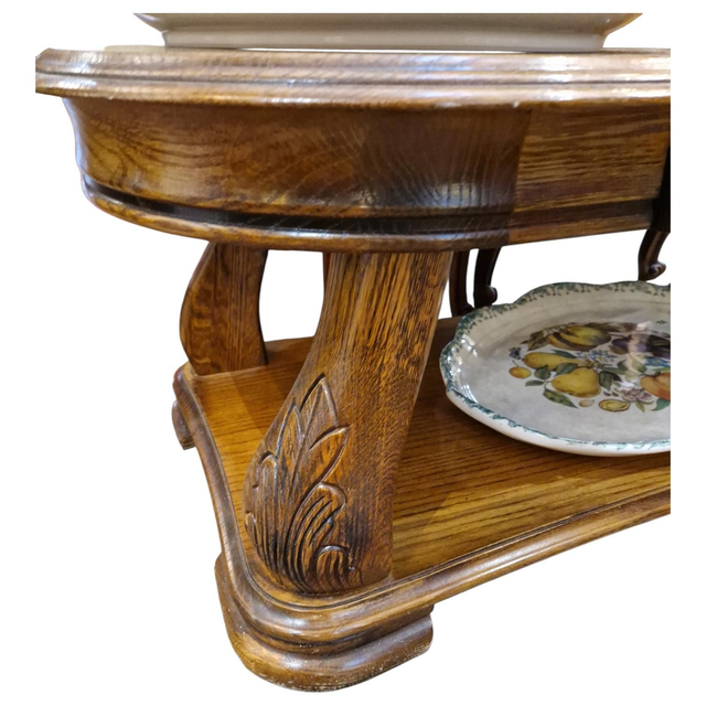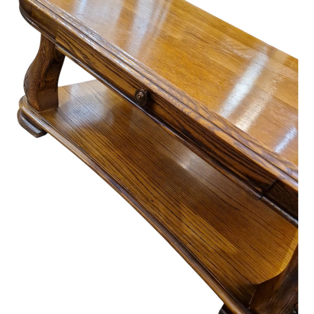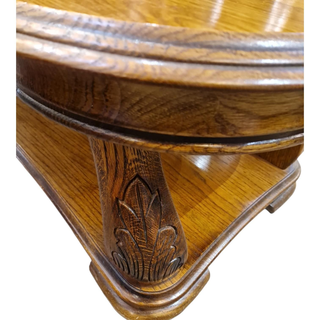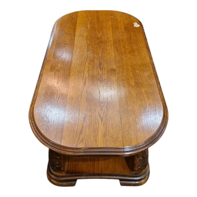 Table basse en chêne massif en très bon état malgré quelques traces d'usures. Possède un tiroir devant et de jolies feuilles gravées au niveau des pieds.